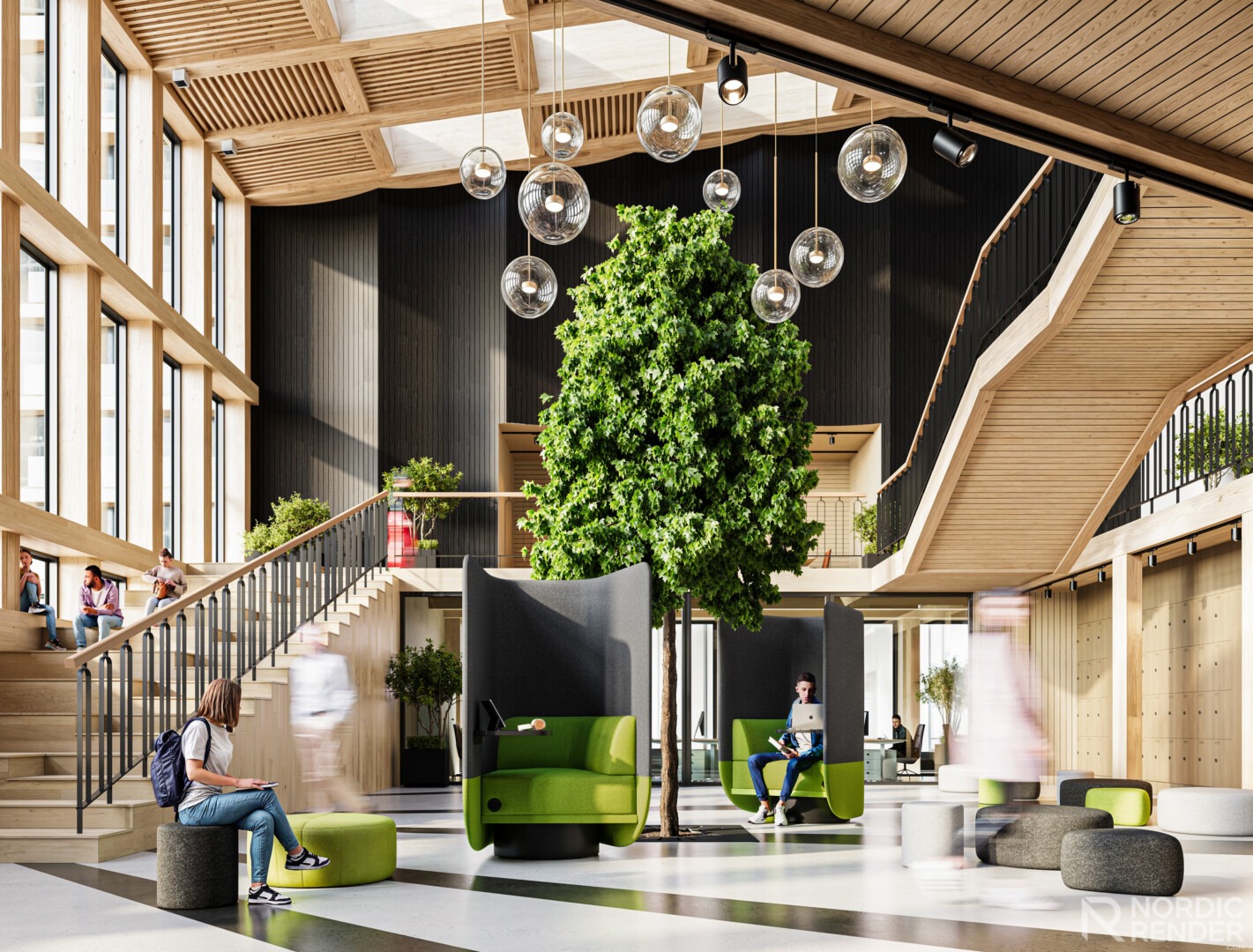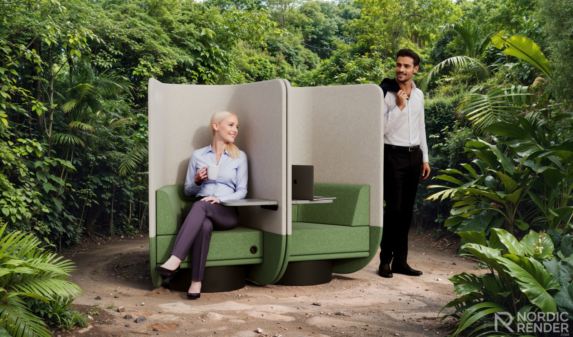 Heute sind wir von der Natur abgekoppelt, wir verbringen viel Zeit im Büro oder zu Hause. Daher wäre es großartig, uns die Natur näher zu bringen. Wenn Sie ins Büro kommen, spüren Sie das Gras zwischen Ihren Zehen und spüren Sie die Behaglichkeit, von viel Grün umgeben zu sein. Stellen Sie sich vor, Sie atmen die feuchte und warme Luft eines tropischen Regenwaldes ein, fühlen Sie sich frei! Es ist wie ein tägliches Abenteuer!