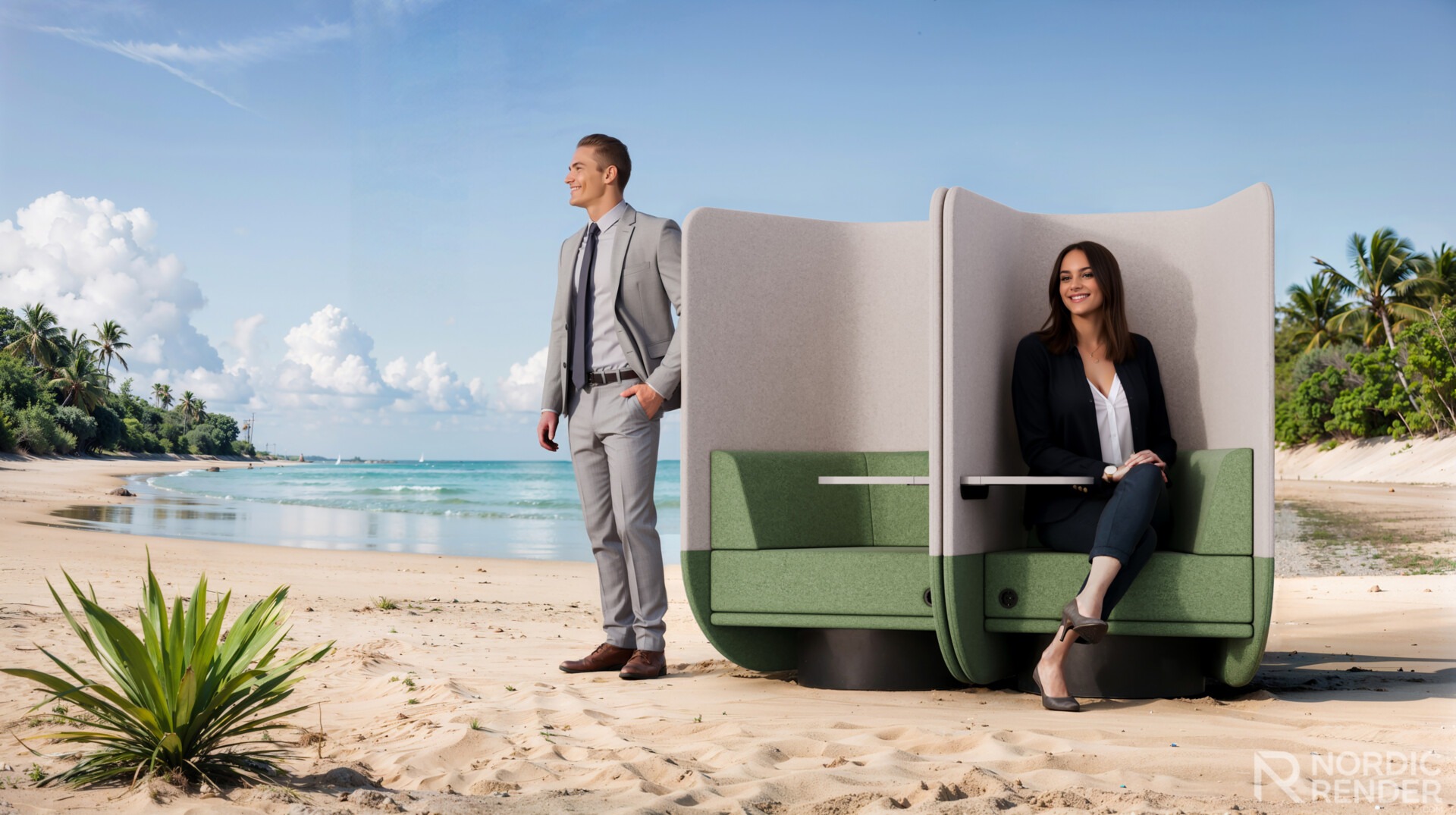 Am Treffpunkt der Geschäftswelt und der erholsamen Idylle der Natur entsteht eine einzigartige Synergie. Diese Arbeit veranschaulicht die Idee, dass Arbeit und Freizeit in perfekter Balance existieren können. Der sonnige Strand wird zum Raum für frische Ideen und eine neue Perspektive auf alltägliche Aufgaben. Umgeben von Wellenrauschen und warmem Sand symbolisiert das Sofa die leichte Zugänglichkeit von Komfort und Ästhetik in allen Arten von Umgebungen. Es ist eine Einladung, die Grenzen des Arbeitsbereichs zu überdenken und Ihre eigene Oase der Produktivität zu schaffen.